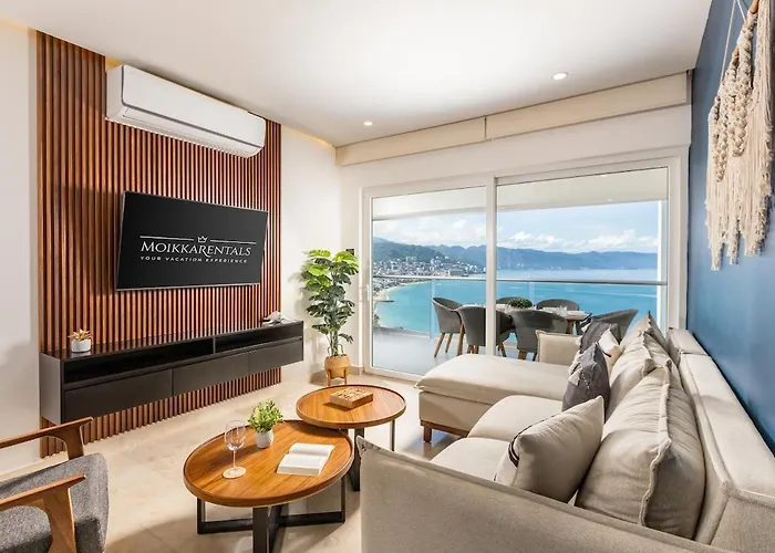 Boasting spa facilities such as a hot tub, the beachfront 130 m² Harbor Nt2307 By Moikkarentals Puerto Vallarta apartment is situated in the Hotel district of Puerto Vallarta, approximately 25 minutes' walk from the Malecón Boardwalk. Staying in this spacious apartment, nestled fairly close to the tranquil Playa Camarones Beach, guests can relax on a terrace.